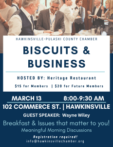 If you are interested in Biscuits & Business, please contact us at (478) 783-1717 or by email at info@hawkinsvillechamber.org.